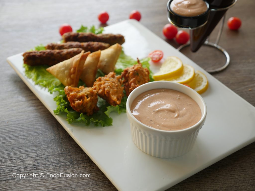 Bowl mein mustard paste,namak,paprika powder,onion powder,kali mirch powder,lehsan powder, worcestershire sauce,sirka,national classic mayo aur national tomato ketchup dal ker ache tarhan mix ker lein.