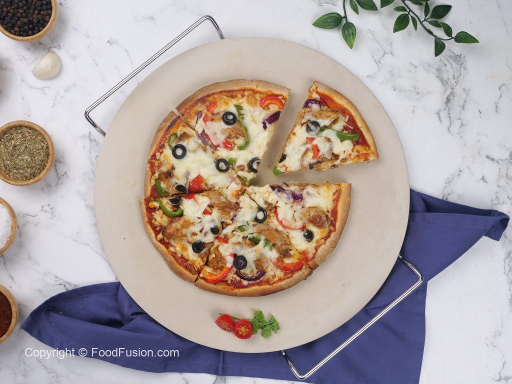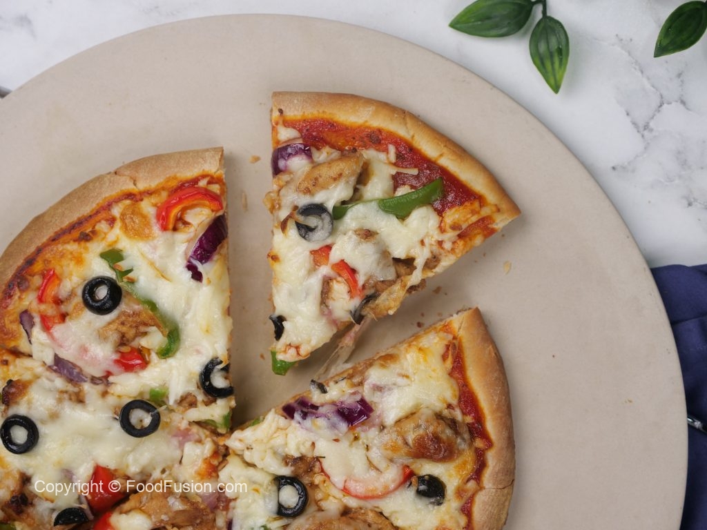 -On pizza base,add & spread pizza sauce,cheese,cooked fajita chicken,red bell pepper,capsicum, onion,cheese,black olive & bake in preheated oven at 180C until cheese melts (8-10 minutes).