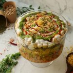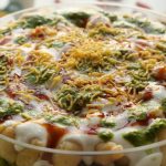 -In a deep serving bowl,add boiled chickpeas,chaat masala,red chilli crushed,prepared hari chutney, mixed vegetable salad,boiled potatoes,prepared meethi chutney,peanuts,sev nimco,prepared yogurt meethi chutney,hari chutney,papri,boiled whole green gram,chaat masala,dahi phulkiyan, yogurt,meethi chutney,hari chutney,red chilli crushed,sev nimco & serve!