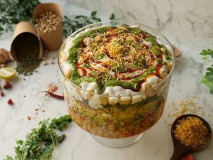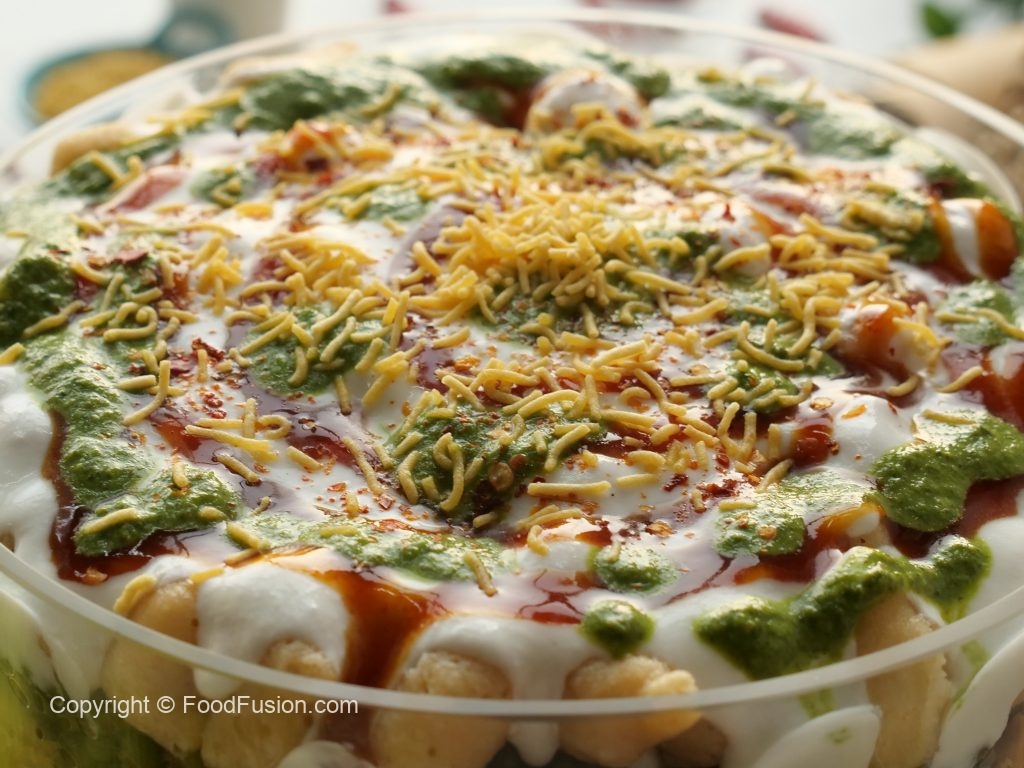 -Deep serving dish mein boiled chanay,chaat masala,lal mirch crushed,tayyar hari chutney,mixed vegetables salad,boiled aalo,tayyar meethi chutney,mong phali,sev nimco,tayyar dahi,meethi chutney,hari chutney,papri,boiled sabut mong daal,chaat masala,dahi phulkiyan,dahi,meethi chutney,hari chutney,lal mirch crushed aur sev nimco dal ker serve karein!
