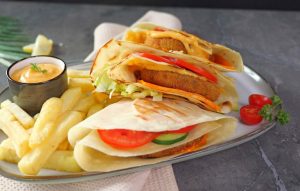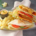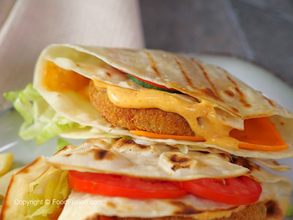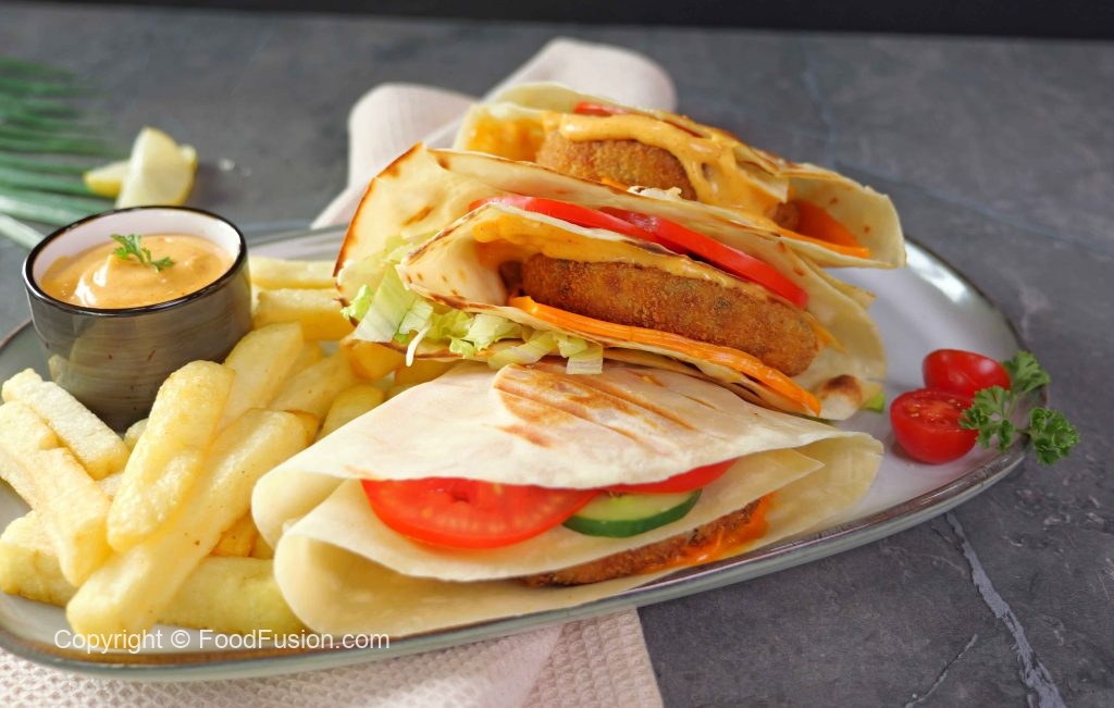 -Add sauce of your choice on one quarter,cheese slice & potato cutlet on second,tomato & cucumber slices on third quarter & add iceberg lettuce on fourth quarter & fold each side on one another making a wrap & serve!