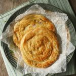 Gently press karein aur baking tray per butter paper laga ker rakh dein aur fork ki madad sa prick ker lein aur brush ki madad sa doodh laga lein (makes 3).