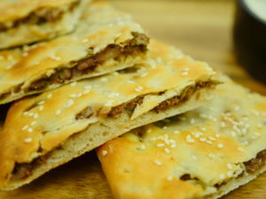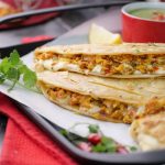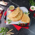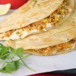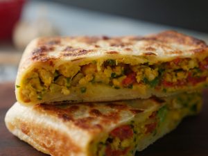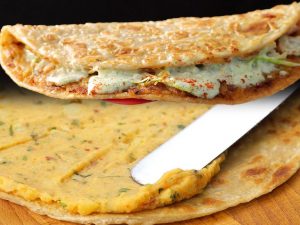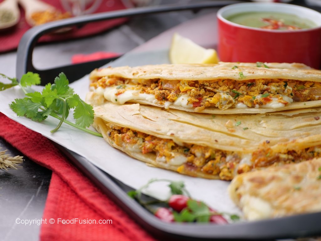 -On one side of paratha,add mozzarella cheese,prepared filling,cheddar cheese & flip the other side of paratha over it & cook from both sides with desi ghee until cheese melts (makes 4) & serve!