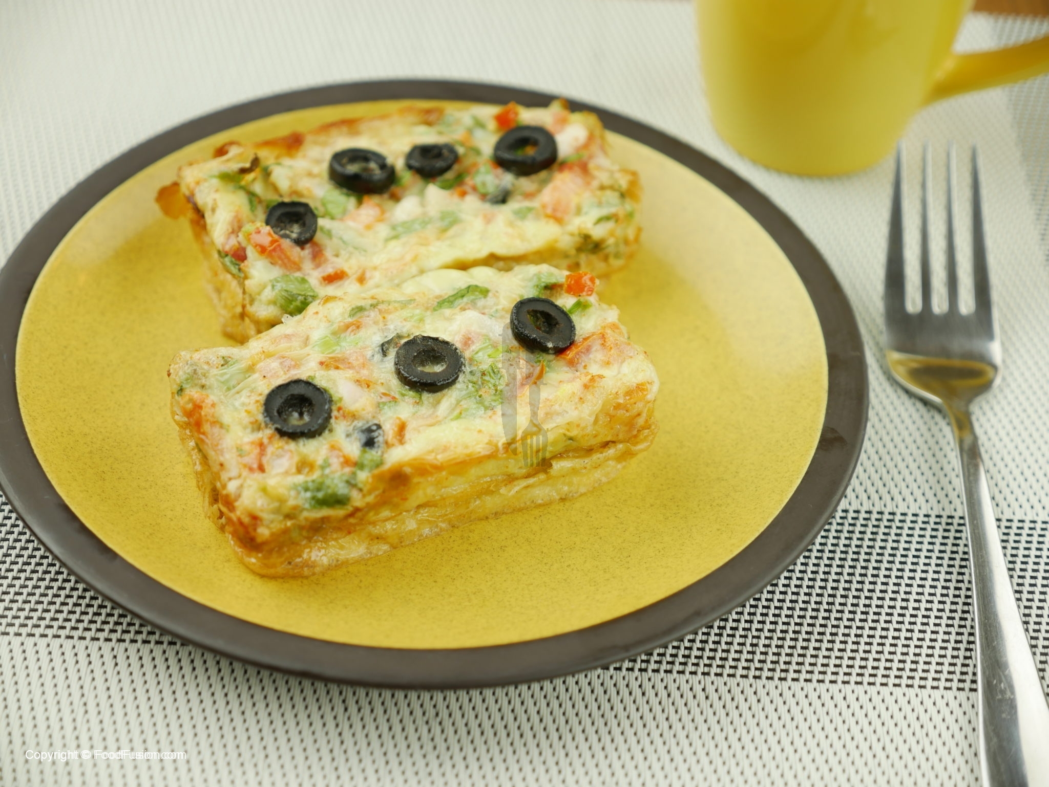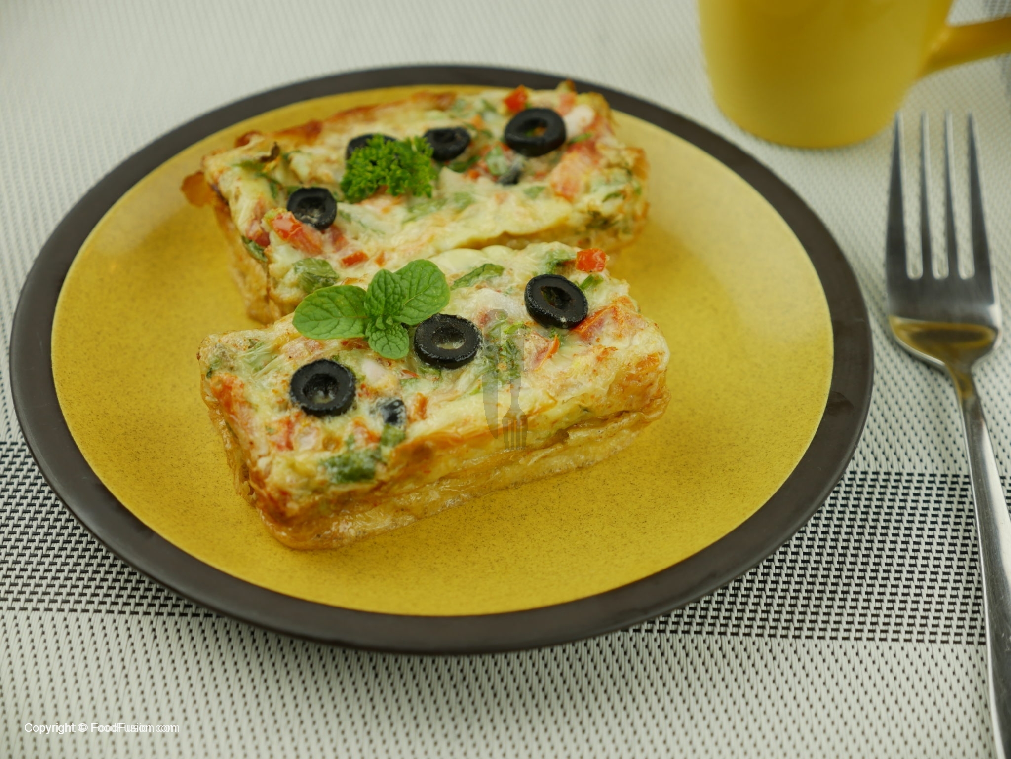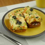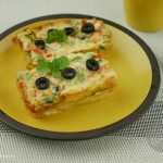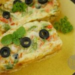 Pour the mixture in the tray compartments and put cheese and few olives on top of it.