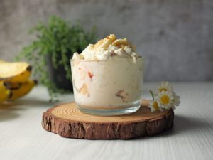 -Pour half quantity in a serving dish & spread evenly,add cake pieces,banana slices,add prepared mixture,cake pieces,banana slices & remaining mixture on top.