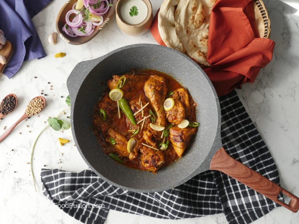 In a wok,add cooking oil,marinated chicken and cook on low flame for 12-15 minutes then cook on high flame for 2-3 minutes and turn sides in between.