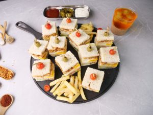 -Four bread slices per mayonnaise dal dein,ek slice per kheera aur tamatar dal dein aur dosray slice per cooked anda dal ker namak aur kali mirch crushed chirak dein.