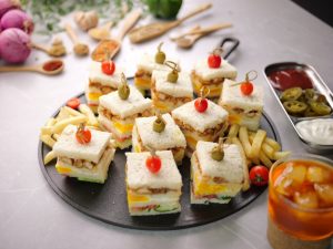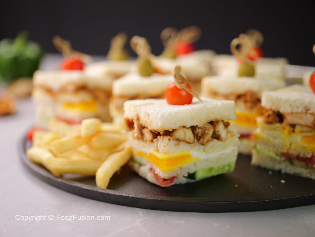 -Third bread slice per tayyar bbq chicken dal ker fourth bread slice ko flip ker lein aur sandwich bana lein aur edges ko trim ker lein (makes 4).