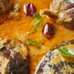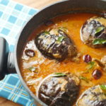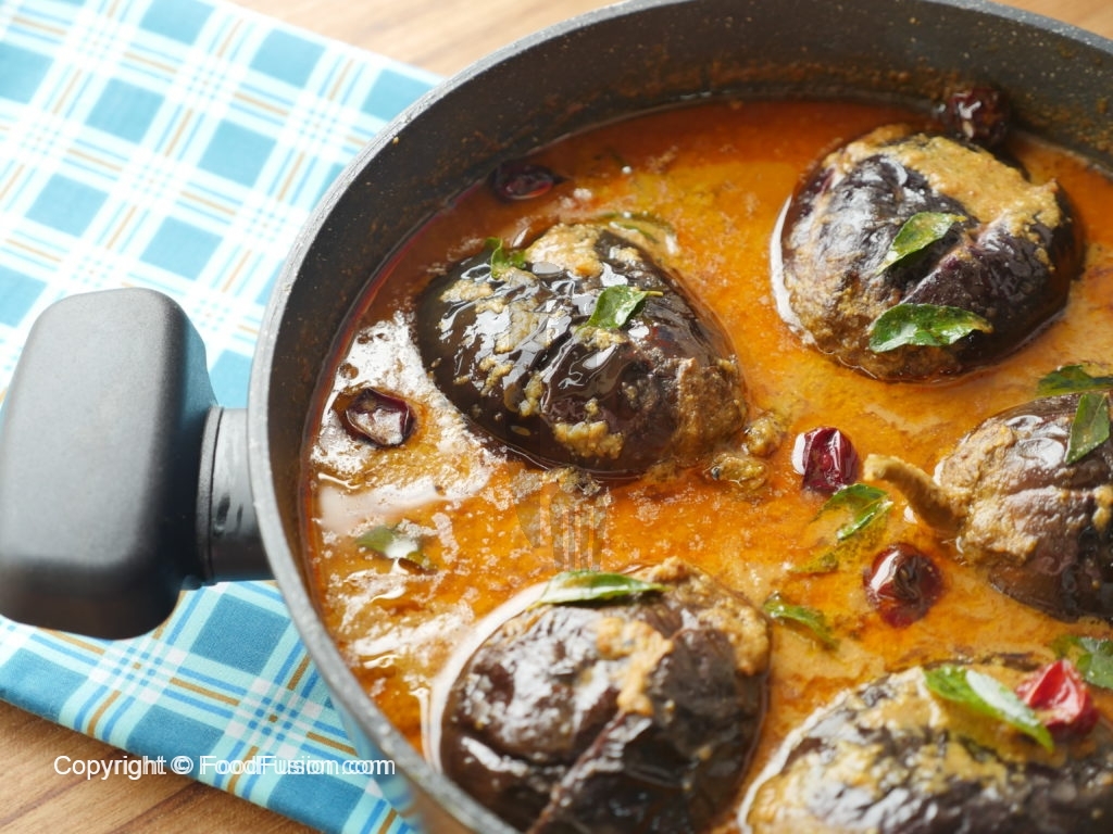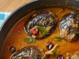 Take egg plants,make 4 small cuts in the eggplant but don’t separate them and keep them intact, including the stem,sprinkle salt and stuffed with ground spice mixture & set aside.