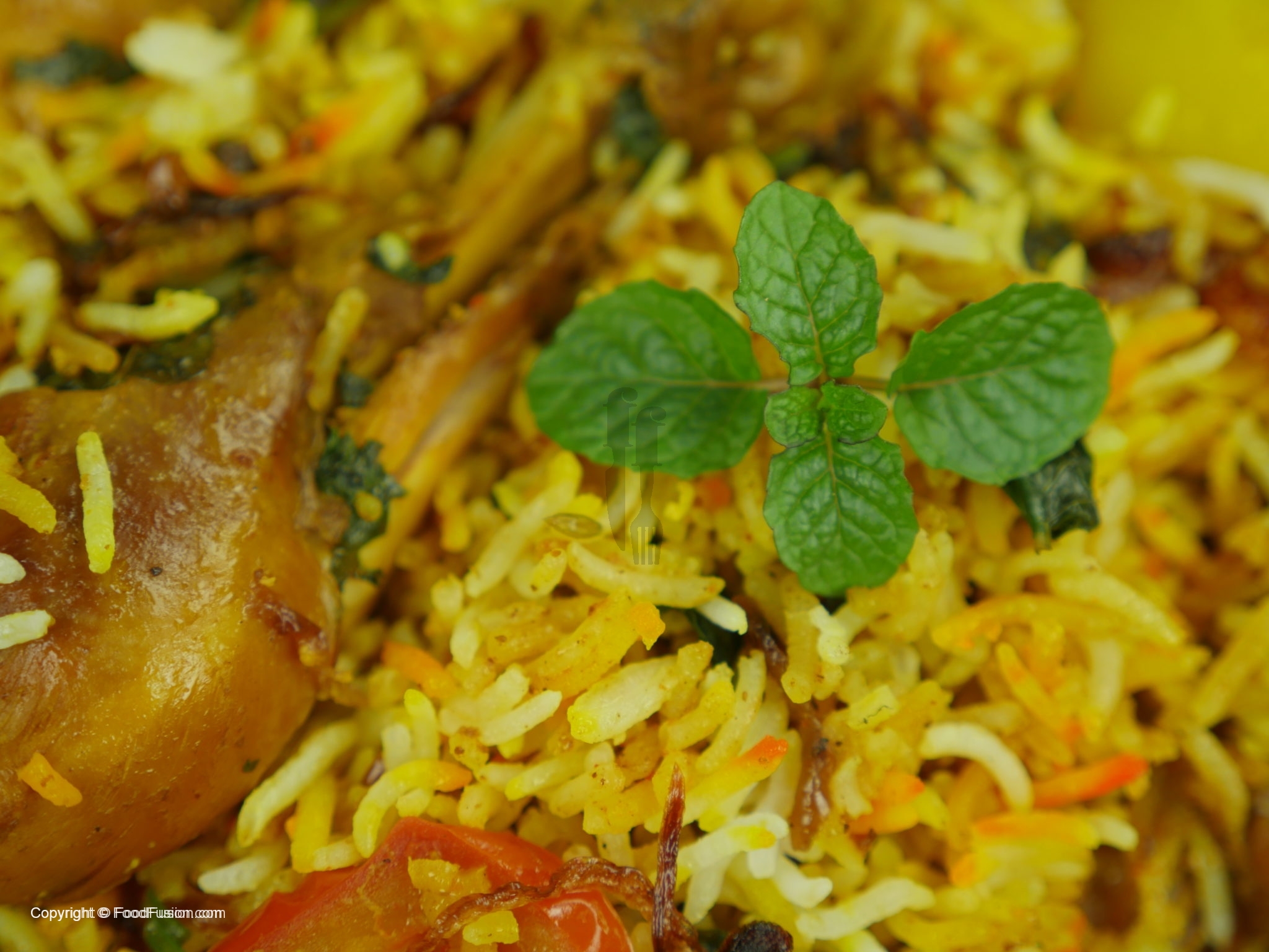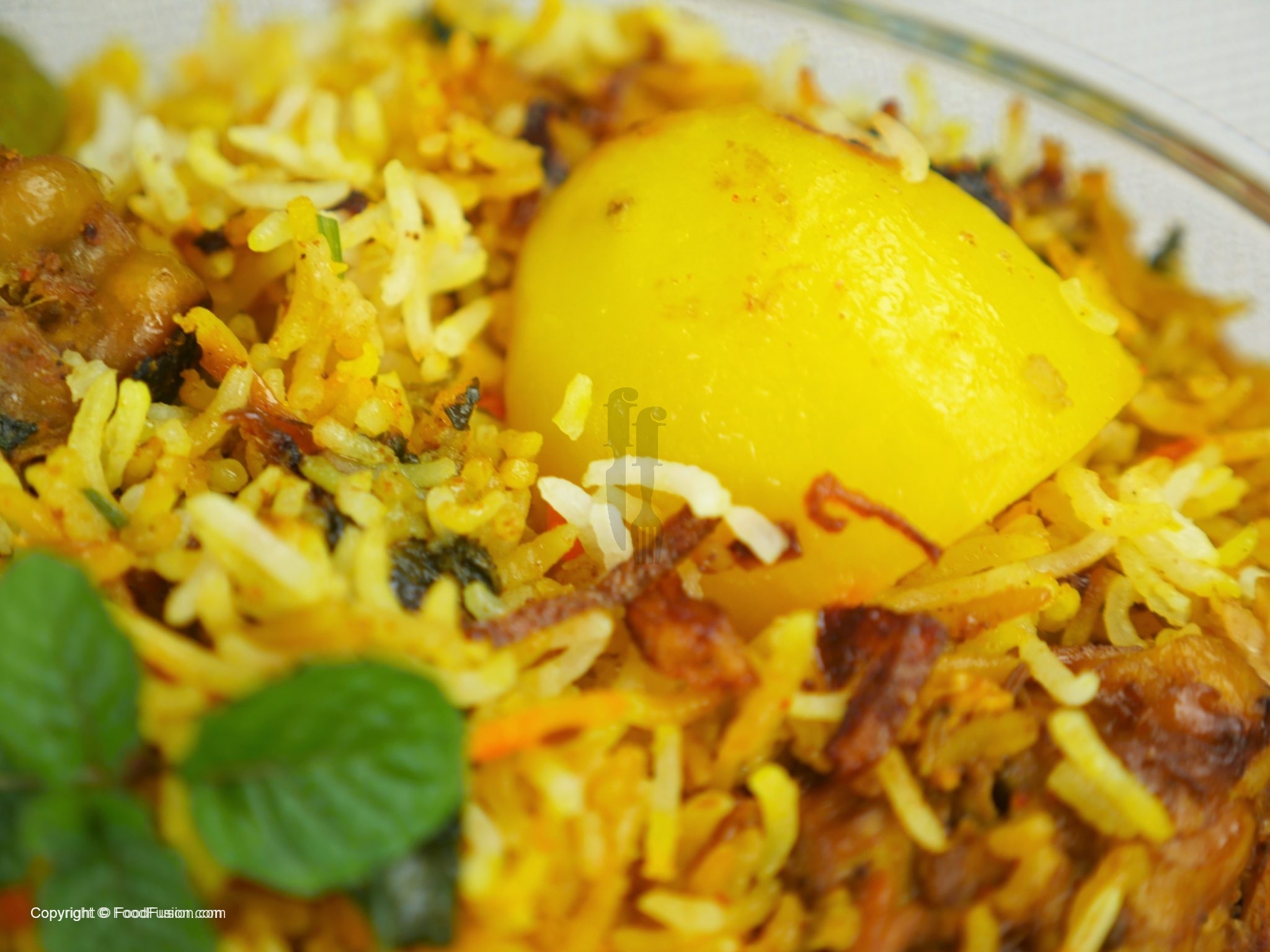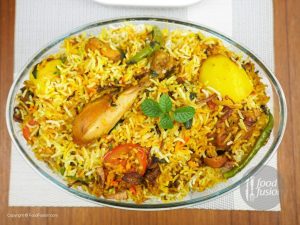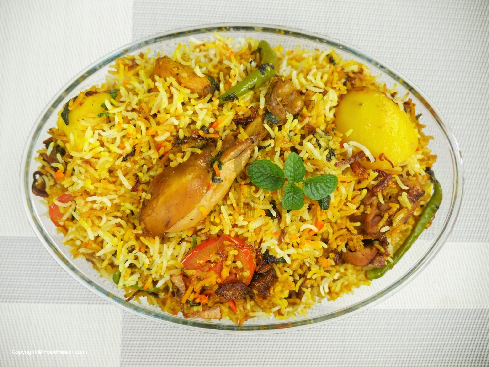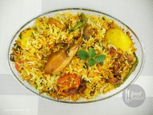 Gravy mein pyaz (fried),tamatar (sliced),podina,hara dhania,hari mirch,dahi,zarde ka rang,chawal boiled,zarde ka rang,pyaz (fried),podina,hara dhania,aalo(boiled) dal ker dhak dein aur 15 minute kliya halki ancch per paka lein.