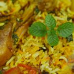In gravy,add fried onion,tomato (sliced),mint leaves,green coriander,green chili,yogurt,food color,boiled rice,food color,fried onion,mint,green coriander,potatoes (boiled),cover and cook on low flame for 10-12 minutes.
