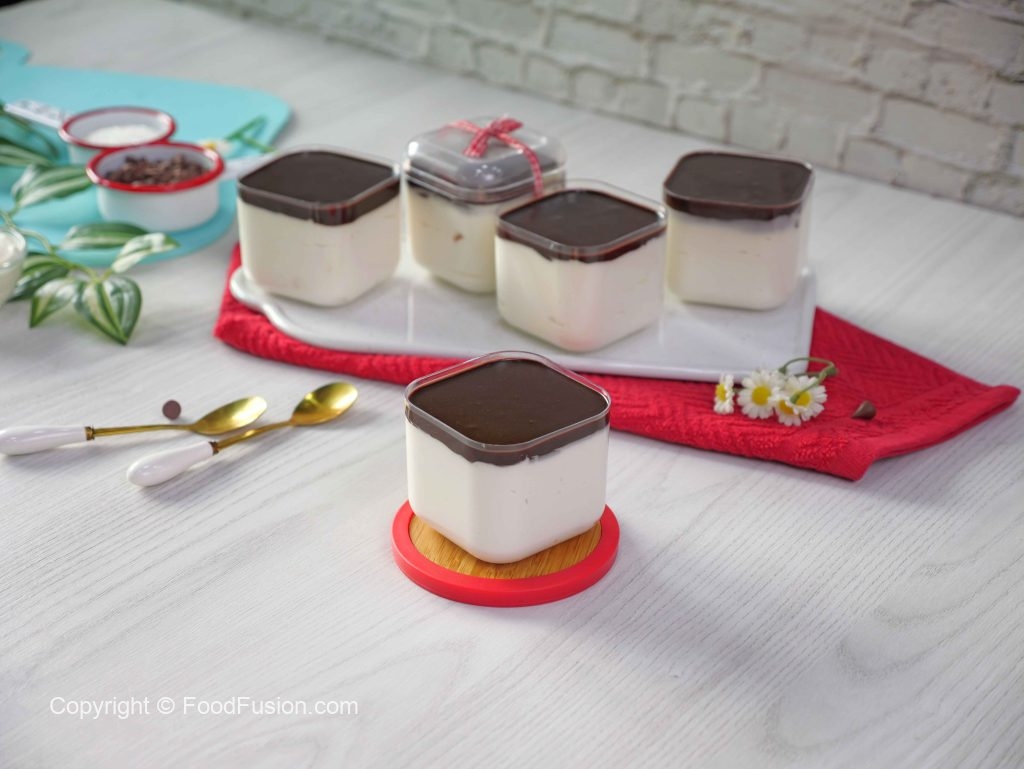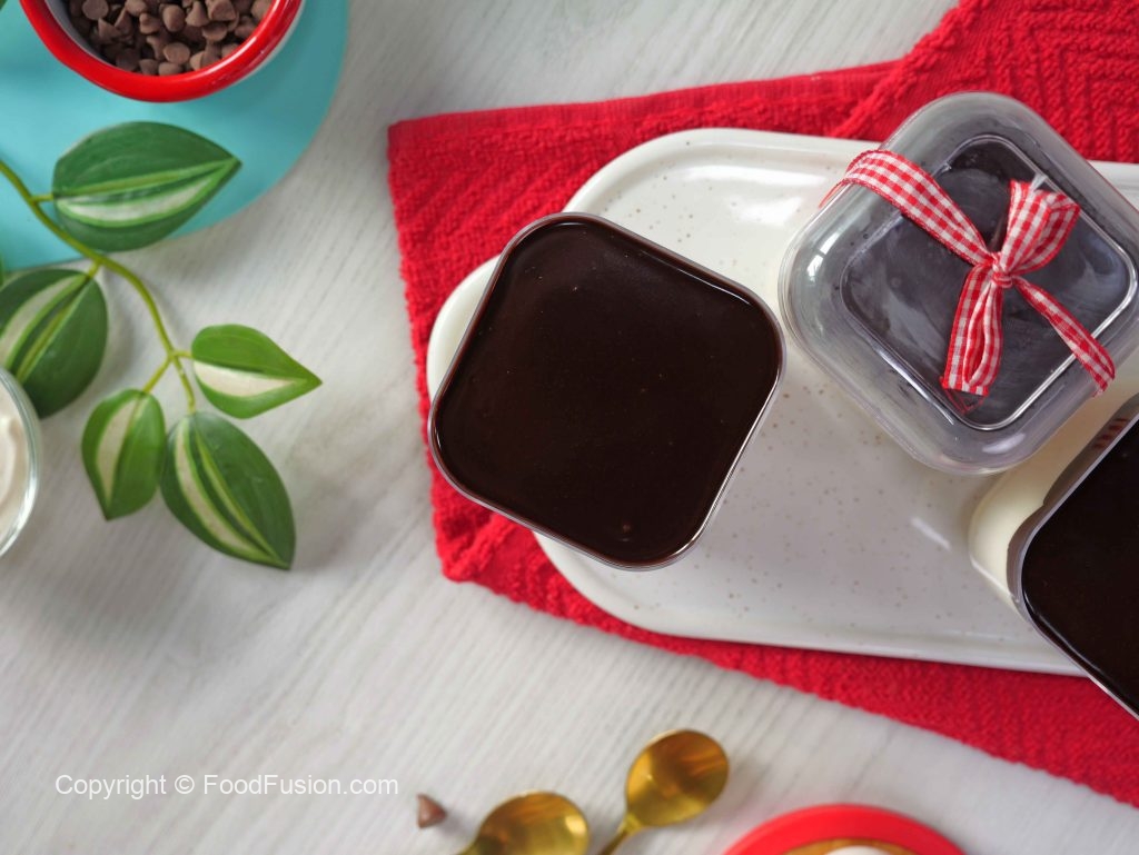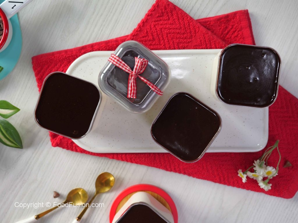 -Upper sa tayyar chocolate ganache pour karein (makes 6) & serve karein!