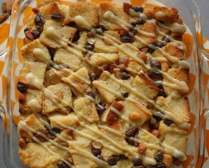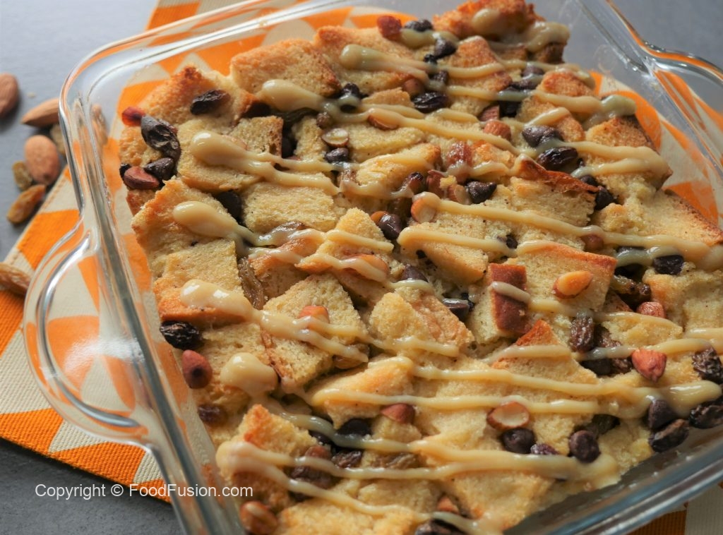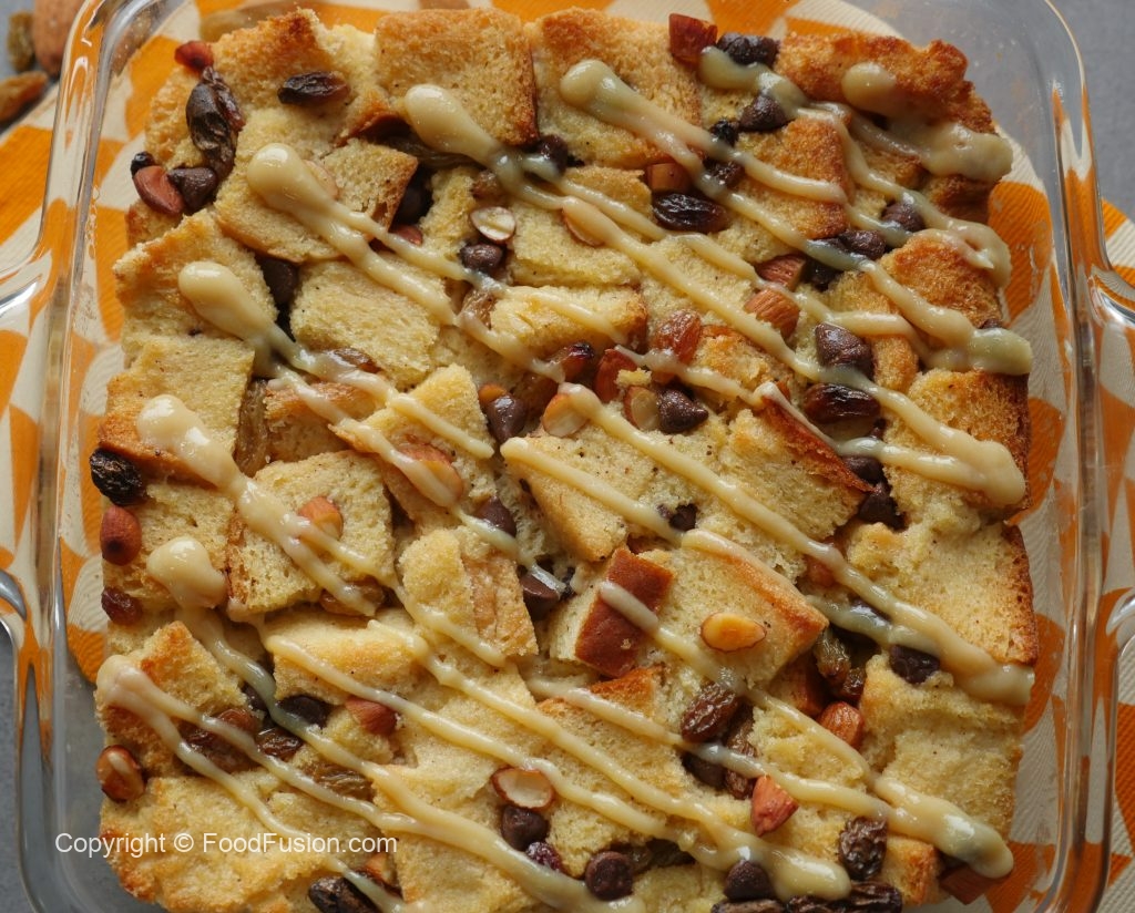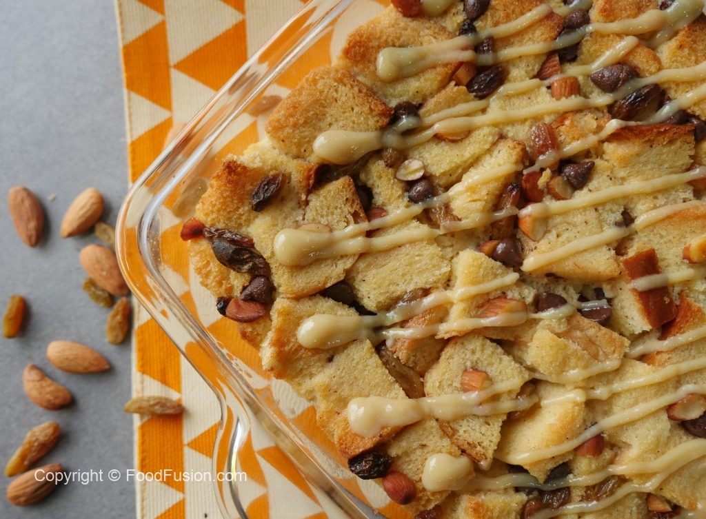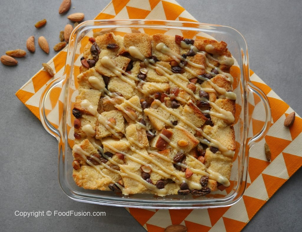 Bread cubes,badam,kishmish,chocolate chips,tayyar anday ka mixture,bread cubes,kishmish,badam, chocolate chips aur tayyar anday ka mixture dal dein.