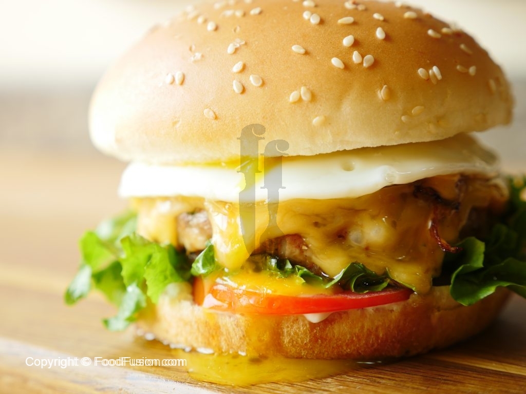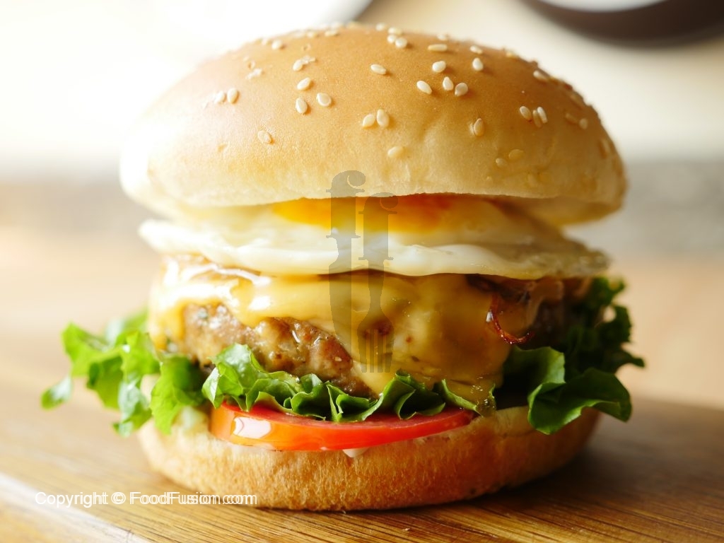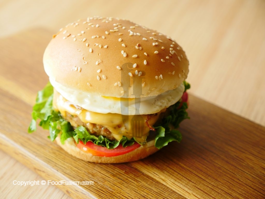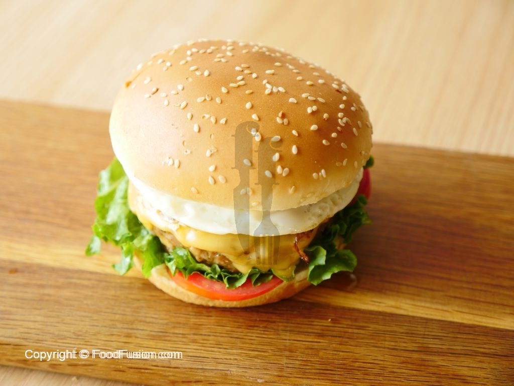 On burger bun,spread mayonnaise,add tomato,lettuce leaf,burger patty,caramelized onion,fried egg and cover with the top bun.