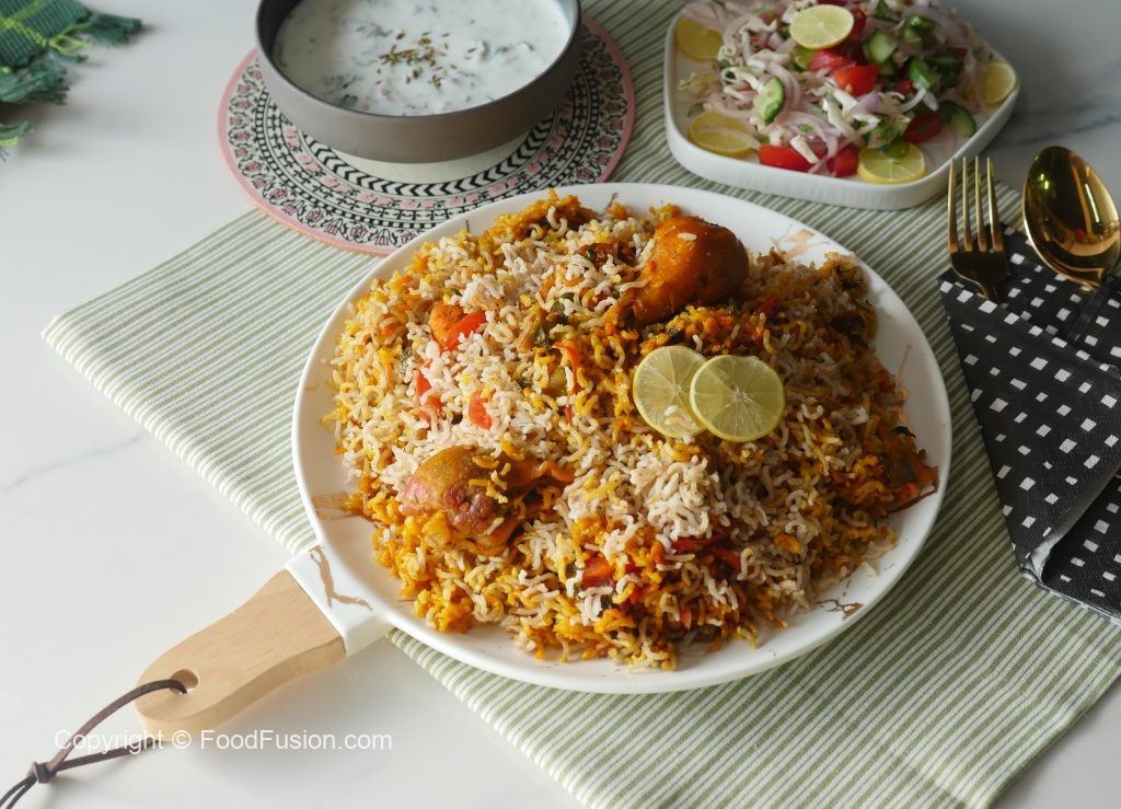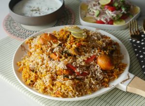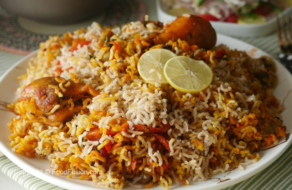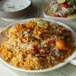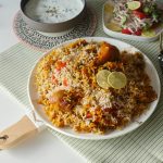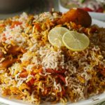 Now add tomatoes & onion mixture,kewra water,yellow food color,boiled brown rice,cover & simmer on low flame for 15-20 minutes.