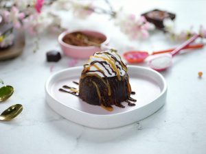-Add prepared caramel sauce & pull all the sides of brownie along with cling film to wrap & make a round ball shape.