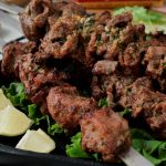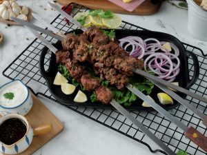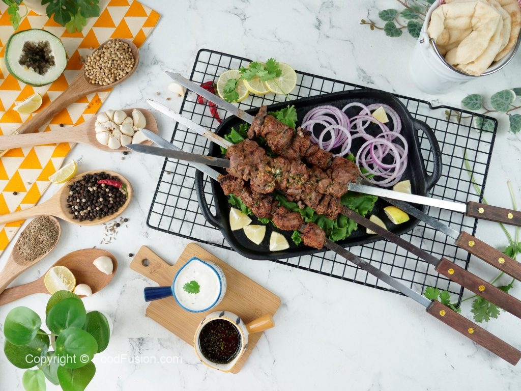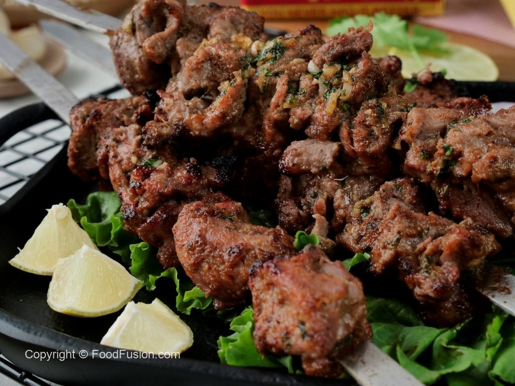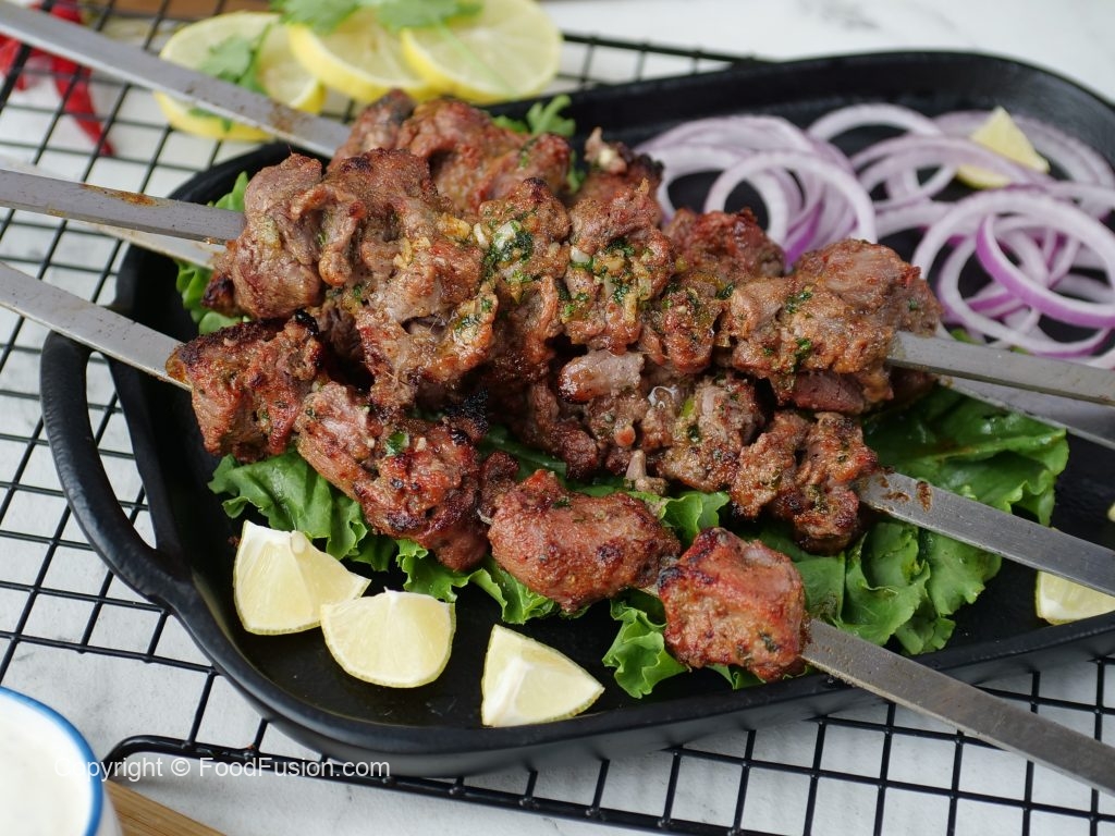 Marinated mutton ko metal skewers per laga lein aur jaltay hoye koyla per paka lein aur bech bech mein tayyar herbed makhan lagatay rahien.