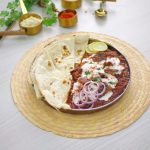 -In a serving platter, add Chapta Cut Kabab Masala, add whisked yogurt, garnish with kashmiri red chilli powder, onion rings, reserved kabab pieces, lemon slices & fresh coriander, and serve with naan!