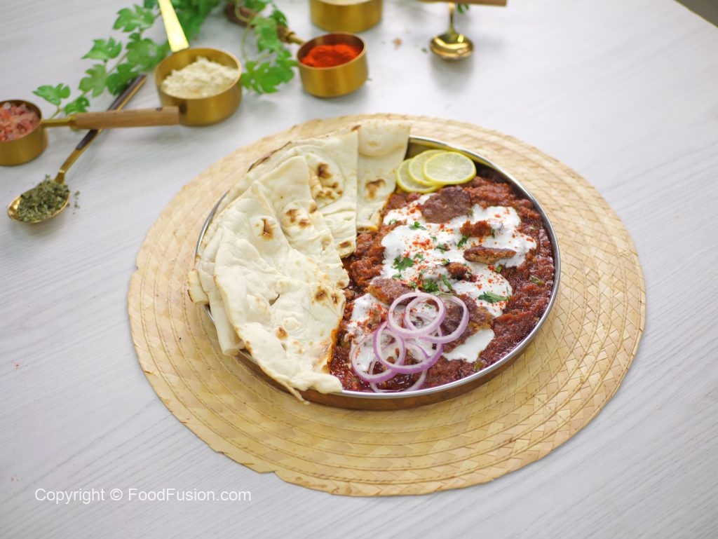 -Serving platter mein Chapta Cut Kabab Masala dalein, upar se whisked yogurt dalen, garnish karein kashmiri red chilli powder, onion rings, reserved kabab pieces, lemon slices aur fresh coriander ke saath, aur naan ke saath serve karein!