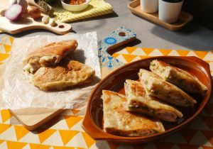 On the empty side of griddle add cheddar cheese,mozzarella cheese & turn stuffed paratha over it and cook another side until golden brown.