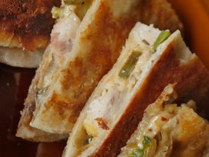 On griddle add & spread mozzarella cheese,cheddar cheese,cooked paratha,cheddar cheese,mozzarella cheese,cooked vegetable,fried fish pieces,mozzarella cheese,cheddar cheese & red chilli crushed.