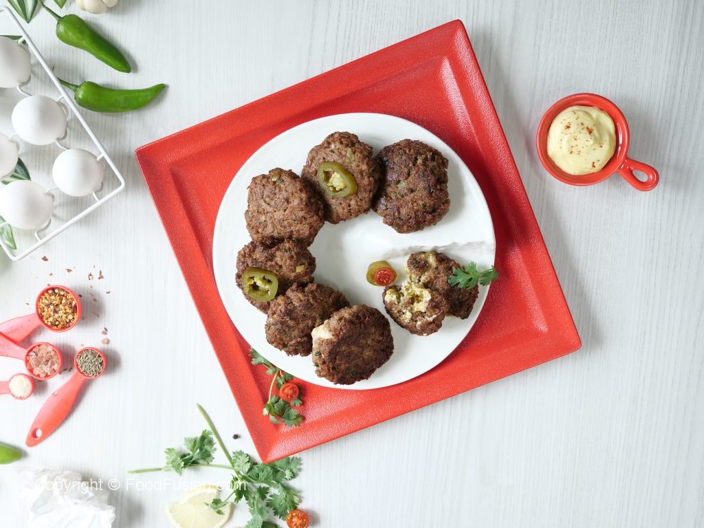 -Take small quantity of mixture (60g) & spread it on your palm,place cheese jalapeno patty & cover properly to make kabab of equal sizes.