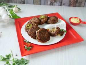 -In a bowl,add beef mince,ginger garlic paste,pink salt,paprika powder,black pepper powder,cumin powder,breadcrumbs,egg,fresh coriander & mix until well combined & marinate for 30 minutes.