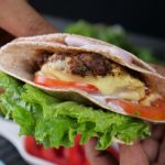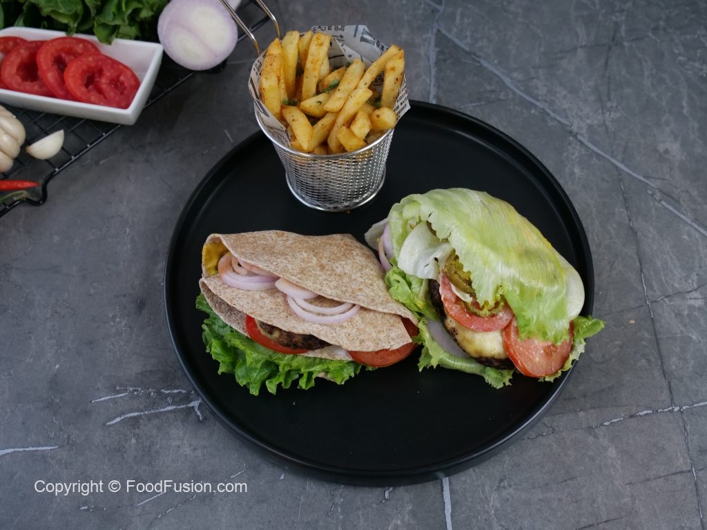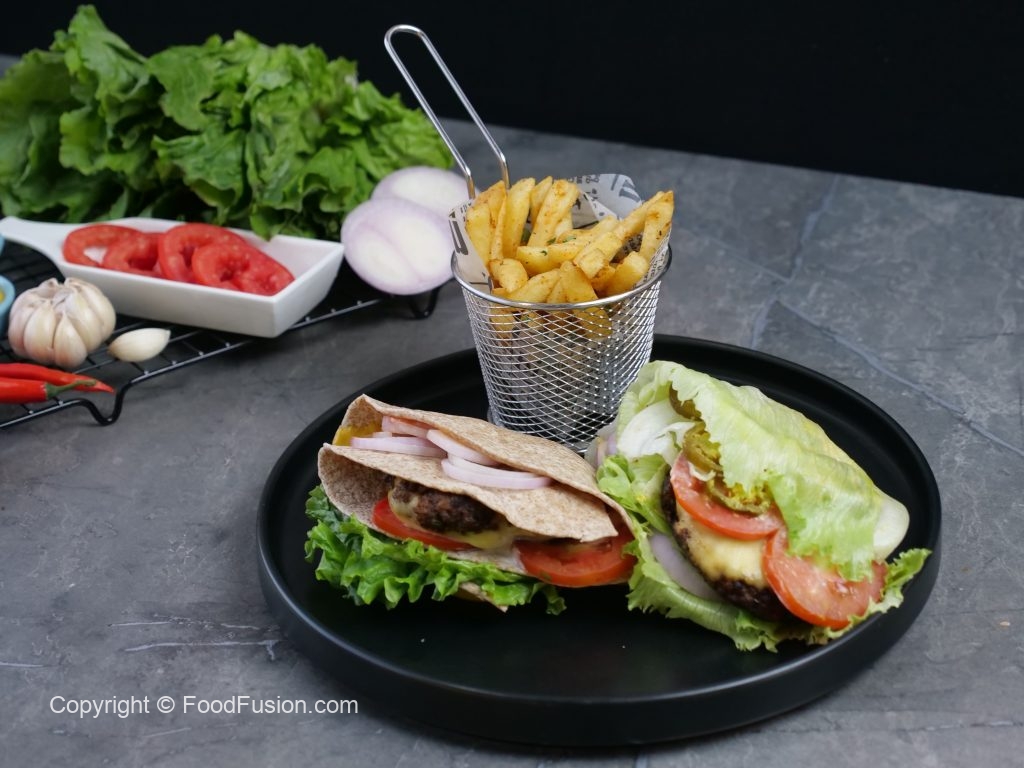 Two iceberg leaves lein aur ek quarter side per mustard paste & pickled jalapeno,dosray per mayonnaise & tamatar slices,tesaray per tomato ketchup & cheeseburger patty aur forth per pyaz rings rakh dein,tamam sides ko fold ker ka wrap tayyar ker lein & serve karein!