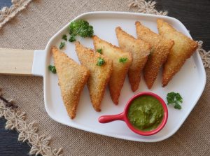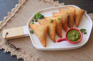 Brush water,place cheese slice,add prepared chicken filling (1 tbs),fold to make a triangle shape,press and seal the edges properly (makes 20-22).