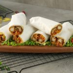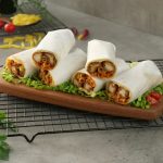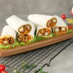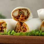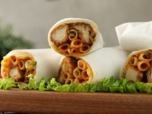-On a tortilla bread, place cheese slices, fried chicken, prepared pasta & roll out tortilla.