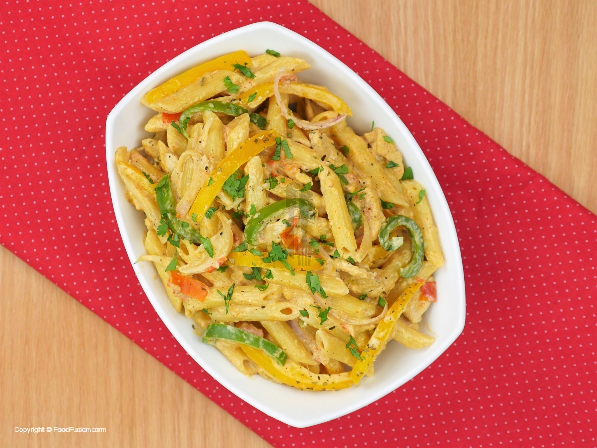-Karhai mein oil,tamatar,fajita seasoning dal ker tamatar naram hunay tak paka lein,cooked chicken, penne pasta cooked aur vegetables dal ker ache tarhan mix ker ein.