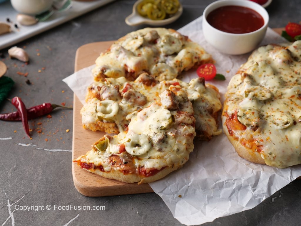 -Pizza sauce dal ker pheela lein,cooked chicken,pyaz,tamatar,pickled jalapenos,mozzarella cheese,cheddar cheese,dried oregano & lal mirch crushed dal dein (makes 6).