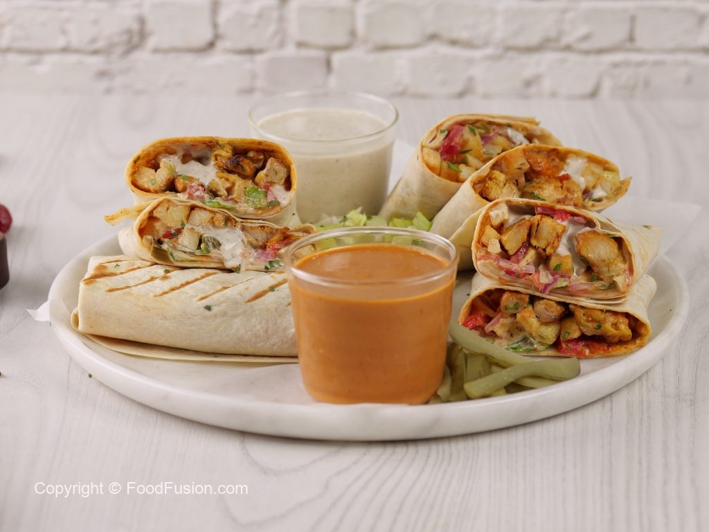 -Add chicken thigh fillets (for juicy shawarma), yogurt, lemon juice, ginger & garlic, cumin, Kashmiri red chilli, turmeric, red chilli, pink salt, coriander powder, tikka masala, fenugreek leaves, and cooking oil in a bowl.