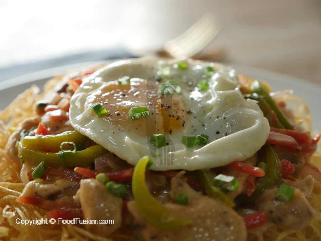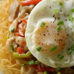 Serving plate mein crispy fried noodles rakh dein aur chicken with sauce,fried anda,kali mirch crushed aur hara pyaz dal ker serve karein.