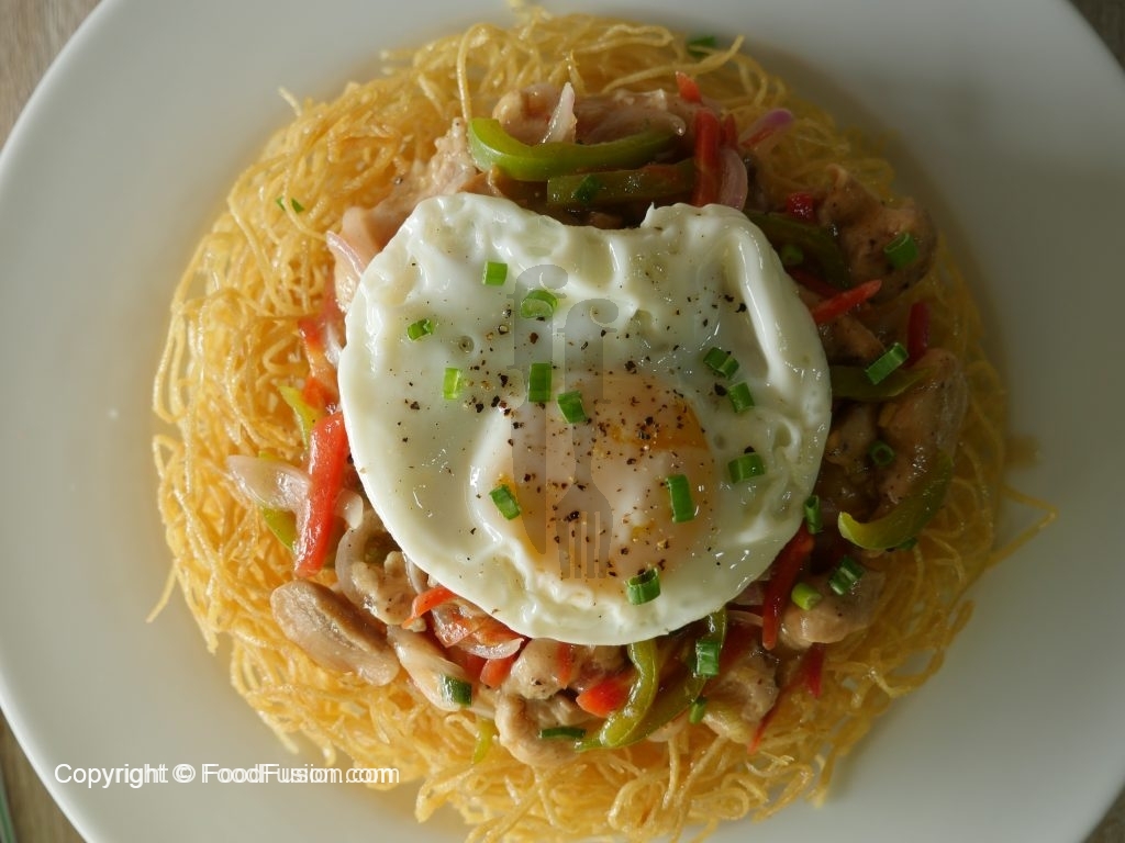 On serving place,place crispy fried noodles,chicken with sauce,fried egg,black pepper crushed,green onion & serve.