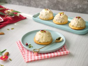 -Take a dome shaped silicone mold,fill each cavity with prepared rabri mixture,spread evenly & freeze for 4 to 6 hours in freezer.