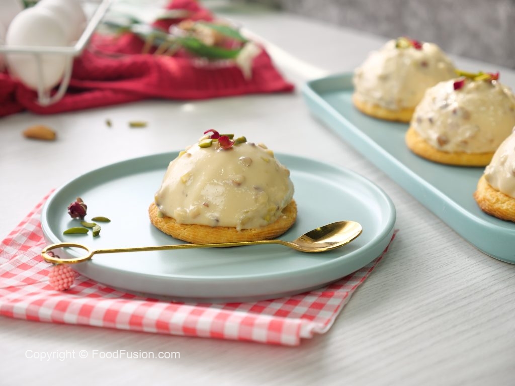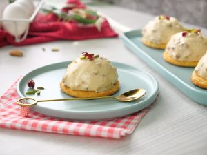 -Add pistachios,almonds,fold gently & transfer to a piping bag.