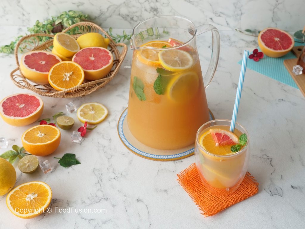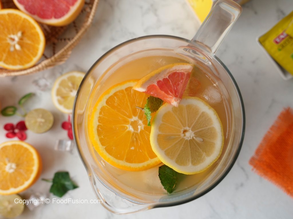 In a jug,add ice cubes,lemon slices,orange slices,grape fruit slices,prepared lemon green tea,grape fruit juice,orange juice,lemon juice and mint leaves,stir & serve!