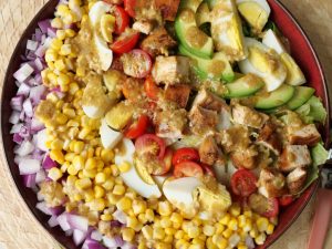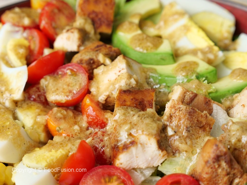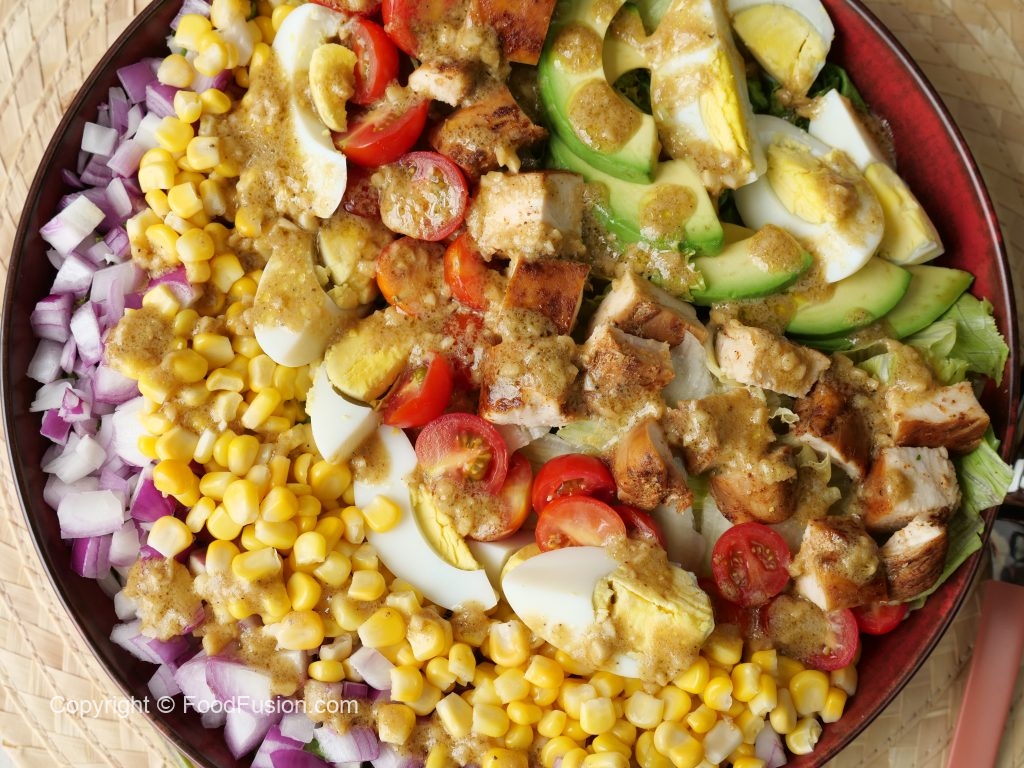 -On a bed of lettuce leaves,add onion,corn kernels,cherry tomatoes,grilled chicken,iceberg,avocado, boiled eggs,pour prepared salad dressing & serve!