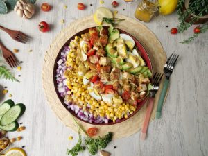 -Lettuce bed per pyaz,corn kernels,cherry tomatoes,grilled chicken,iceberg,avocado,boiled anday aur tayyar salad dressing dal ker serve karein!