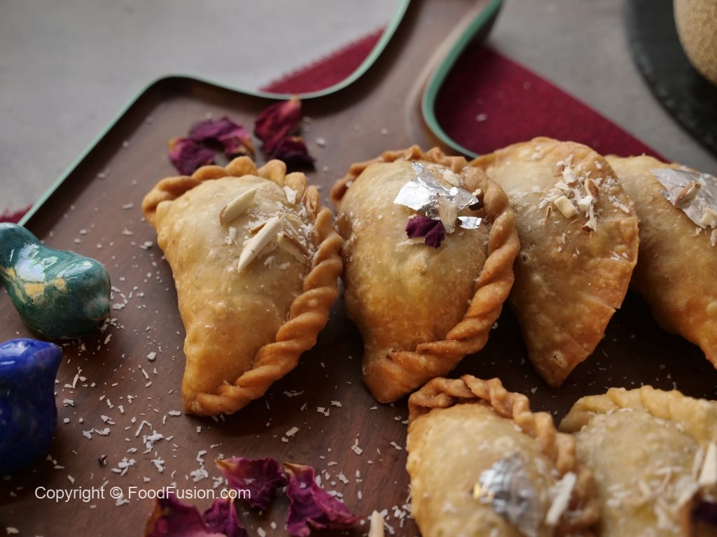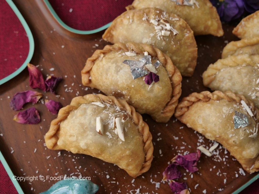 Round dough mein creamy coconut filling dal ker edges per pani laga lein, ek side ko flip ker lein aur fold ker ka samosa ki shape bana lein (makes 22-23).