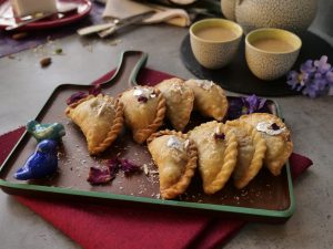 Brush oil on creamy coconut samosa & bake in preheated oven at 200C for 20-25 minutes (flip in between once after 15 minutes).