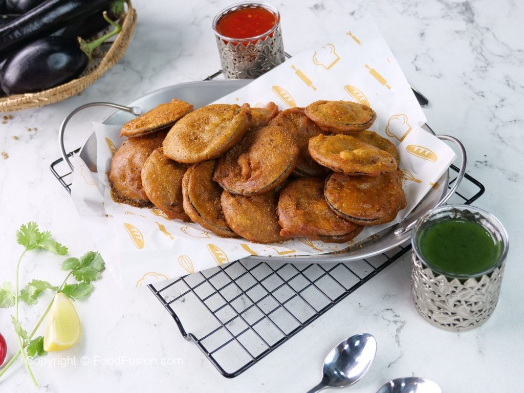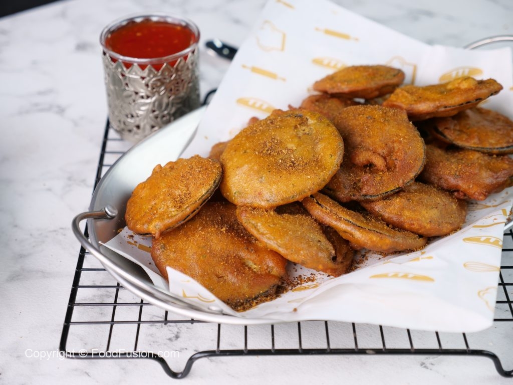 -Karahi mein cooking oil garam karein aur baingan slices ko pakora batter mein dip karein aur halki ancch per golden ho janay tak fry ker lein.