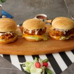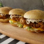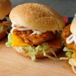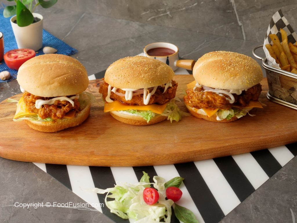 On burger bun,add mayonnaise,add iceberg,cheddar cheese slice,buffalo sauce coated chicken,onion rings,mayonnaise & top with another bun (makes 4).