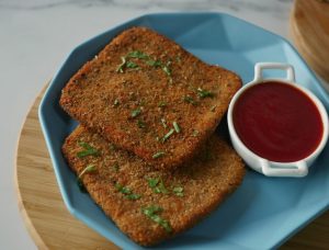 Grease hands with oil,take a mixture and make a ball (65 gms),coat in breadcrumbs,press and shape into square shape then dip into beaten eggs and again coat in breadcrumbs (makes 8-9).