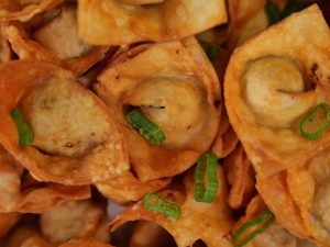 -Phir ek corner par slurry lagain aur overlap karain taake wonton shape ban jaye. (Is recipe se 35-40 wontons ban jaenge)