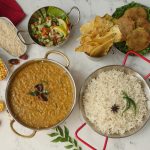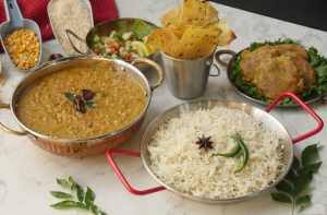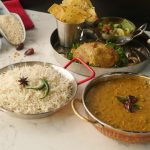 Dish out rice, daal, garnish with fresh coriander, kababs & serve with salad.