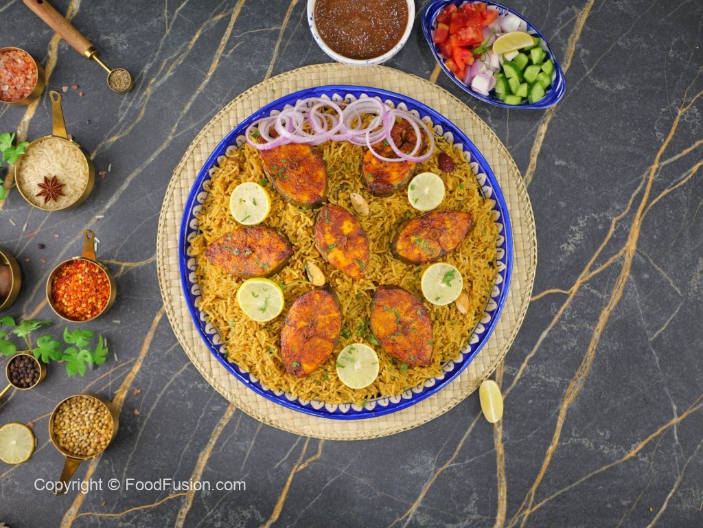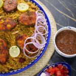 -In a serving platter, add mandi rice, baked fish, garnish with lemon slices, give a coal smoke & serve with prepared mandi sauce & salad!