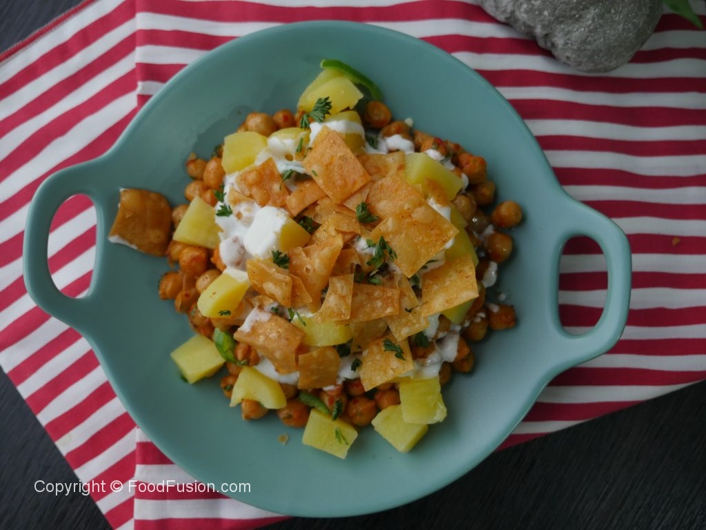 On serving plate,add cooked chickpeas,boiled potato,green chili,yogurt,papri,fresh coriander & serve!