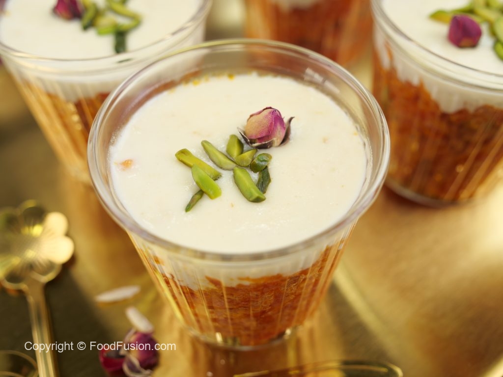 -Serving glass mein tayyar gajar halwa aur creamy khoya dal dein,pista aur dried rose sa garnish ker ka serve!